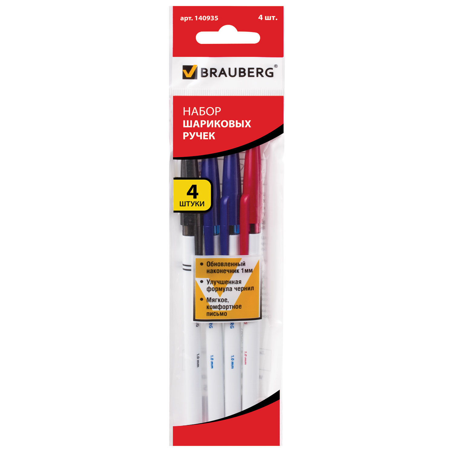 Ручки шариковые BRAUBERG, НАБОР 4 шт., АССОРТИ, Офисная, узел 1 ...