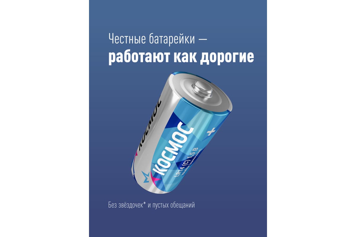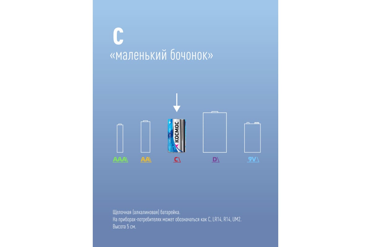 Алкалиновая батарейка LR LR14 Максимум BP2 КОСМОС KOCLR14MAX2BL используется для питания устройств с низким и средним потреблением энергии: фонари, стерео системы, игрушки. Изделие эксплуатируется в широком диапазоне температур от -30 °С до +50 °С. Срок хранения – 7 лет.