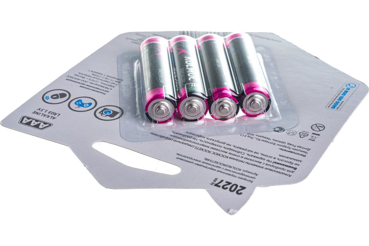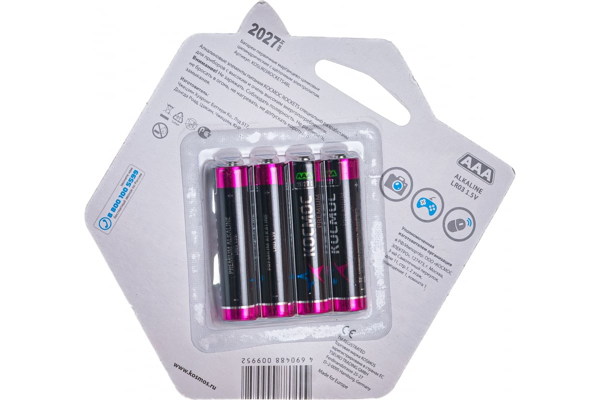 Алкалиновая батарейка LR03 KOSMOS premium ROCKETS КОСМОС KOSLR03ROCKETS4BL используется для питания устройств с высоким и очень высоким уровнем потребления энергии: фонари, цифровые фотоаппараты, вспышки, механические игрушки. Изделие эксплуатируется в широком диапазоне температур от -30 °С до +50 °С. Срок хранения – 7 лет. Тип упаковки — блистер.
