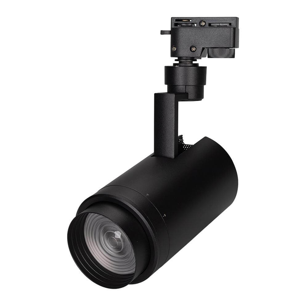 Светильник подвесной для треков/шин 2 провода, 20Вт. Цвет свечения БЕЛЫЙ 6000K, световой поток 1600-2000лм, регулируемый угол 20-60°, CRI>90. Корпус круглый, металл, цвет черный, IP20. Размеры DxHxL Ø88x200x162мм. Входное напряжение AC220-240V, мощность 20Вт. Драйвер встроенный (30-42V, 500mA).