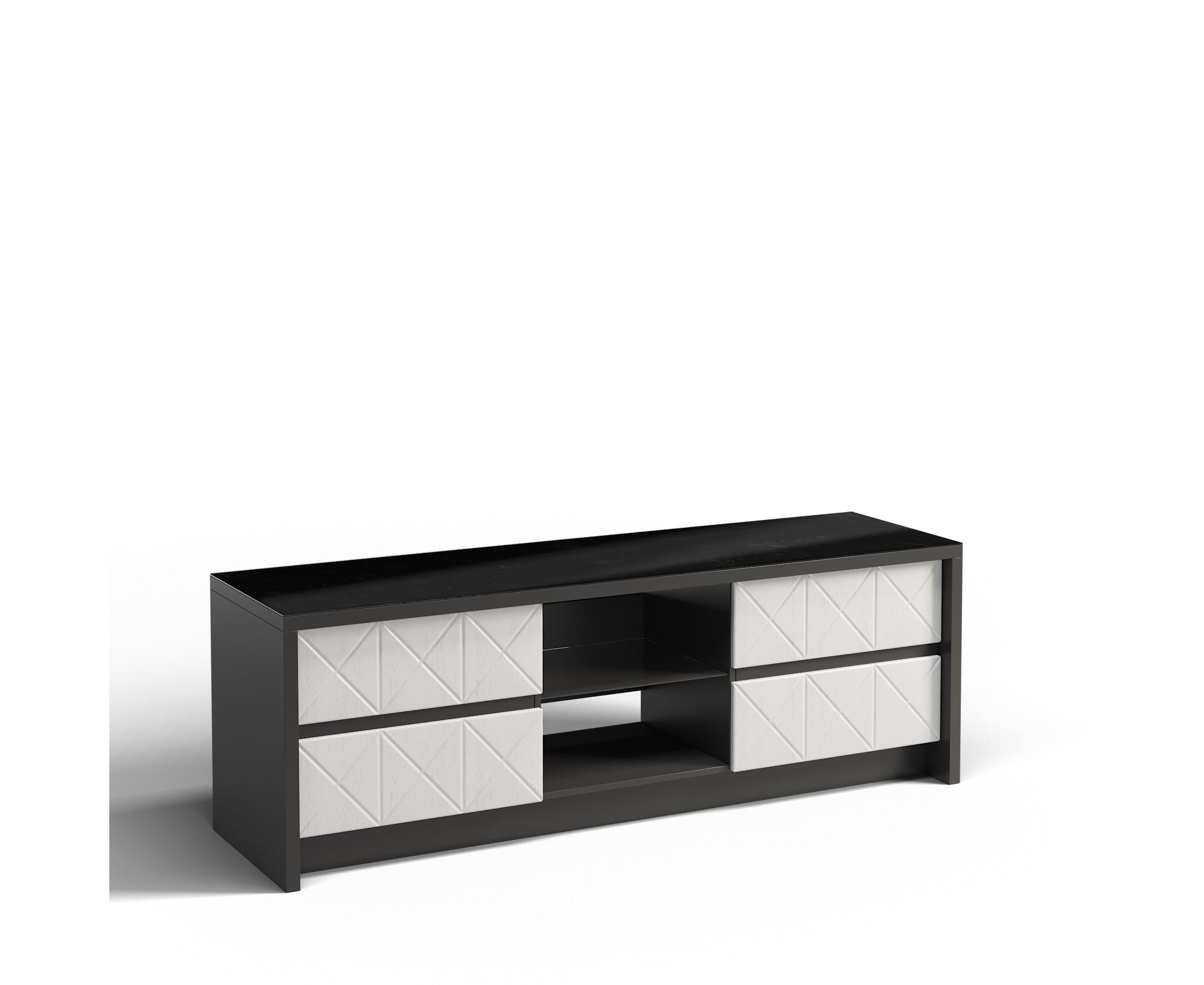 Четыре ящика на шариковых направляющих///задняя стенка изготовлена из ХДФ. На крышке установлено стекло лакобель серого цвета. Лакобель представляет собой специальным образом окрашенное стекло. Функцию ручки на накладках ящиков выполняет фрезеровка выемка в торце фасад.
