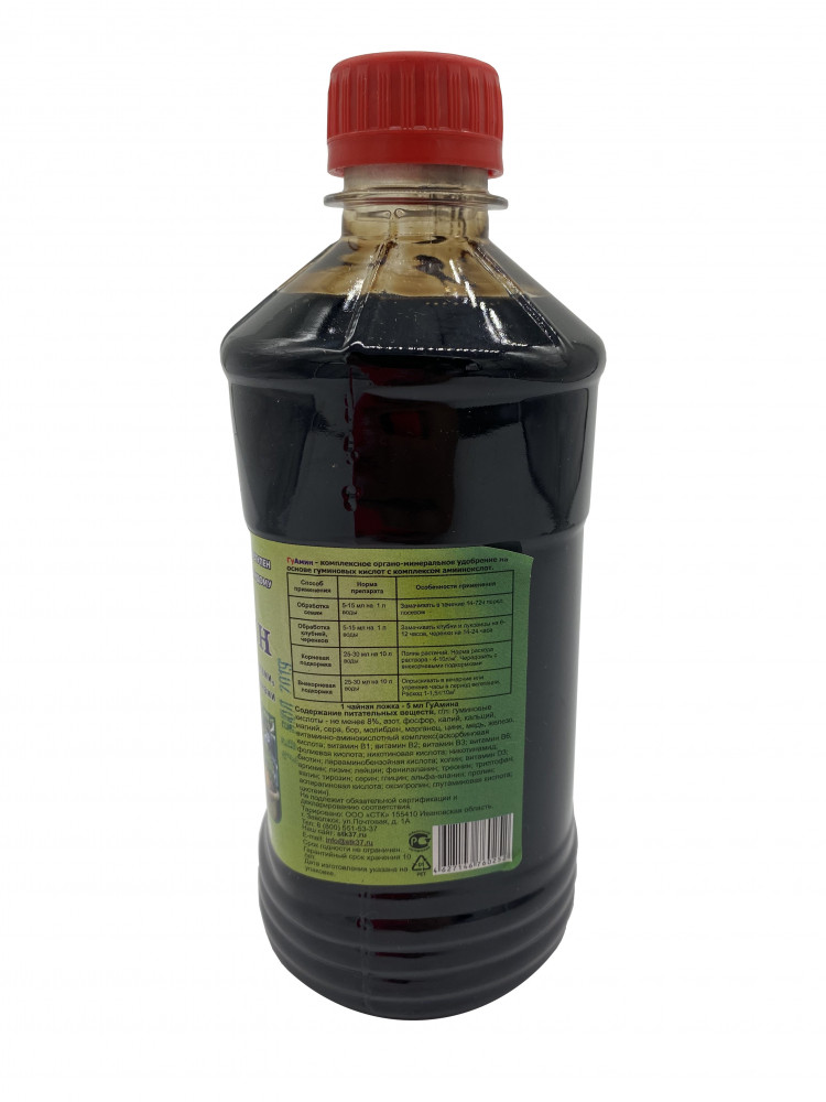 Состав: содержание питательных веществ, г/л: гуминовые кислоты - не менее 8%, азот, фосфор, калий, кальций, магний, сера, бор, молибден, марганец, цинк, медь, железо, витаминно-аминокислотный комплекс