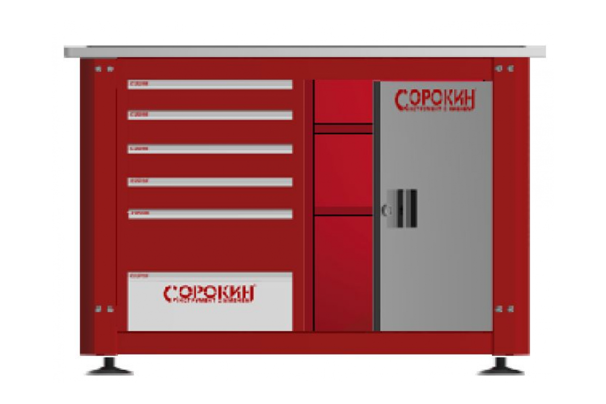Верстак Сорокин 2.2 предназначен для выполнения работ по сборке, разборке, ремонту деталей и узлов. Подходит для использования в небольших мастерских. В конструкции верстака предусмотрены 6 выдвижных ящиков, которые позволяют сортировать и аккуратно хранить инструменты и детали. Металлическая конструкция делает стол прочным.