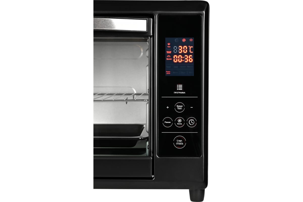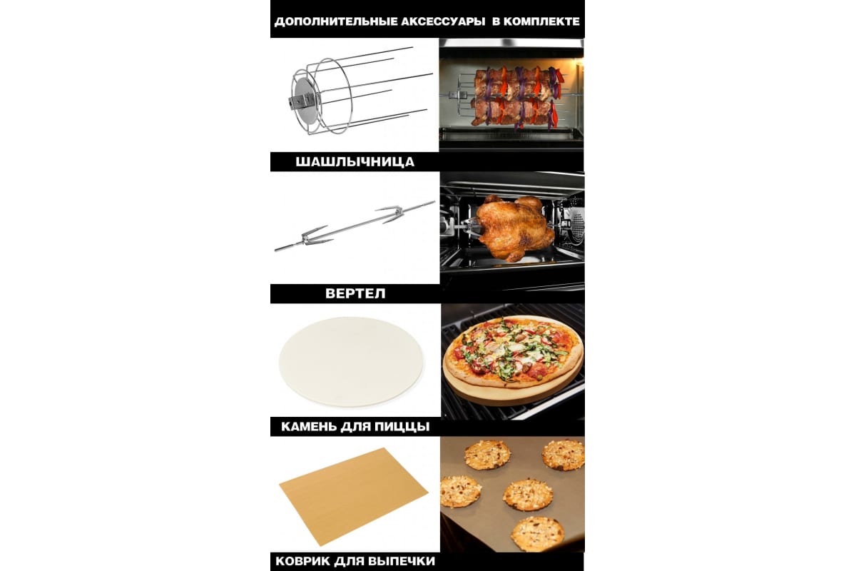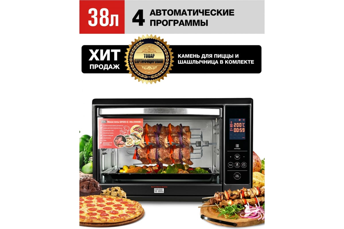 Многофункциональная мини-печь GFGRIL GFOO-5 отличается удобным электронным управлением с возможностью выбора одной из 4-х предустановленных программ (Мясо, Рыба, Выпечка или Разморозка). Конвекция в сочетании с различными режимами работы (Вертел/Верхний нагрев/Нижний нагрев/Нагрев), а также широкий набор аксессуаров, входящих в комплект - противень, решетка-гриль, вертел, шашлычница, камень для пиццы и антипригарный коврик - дают простор для воплощения любых кулинарных фантазий. Предустановленные температуру и время в каждом режиме можно корректировать вручную - температура регулируется от 25 до 230оС, а время - от 1 мин до 10 часов. Функция Отложенный старт дает возможность получить свежеприготовленное блюдо к установленному времени. Высокая мощность 2000 Вт. Благодаря оптимальным размерам мини-печь экономит место и удобна при транспортировке. Она подойдет для маленькой кухни, дачи, квартиры-студии, автодома или офисного помещения. Внутренняя камера мини-печи имеет поверхность легкой чистки, а также оснащена подсветкой для возможности наблюдения за процессом приготовления.