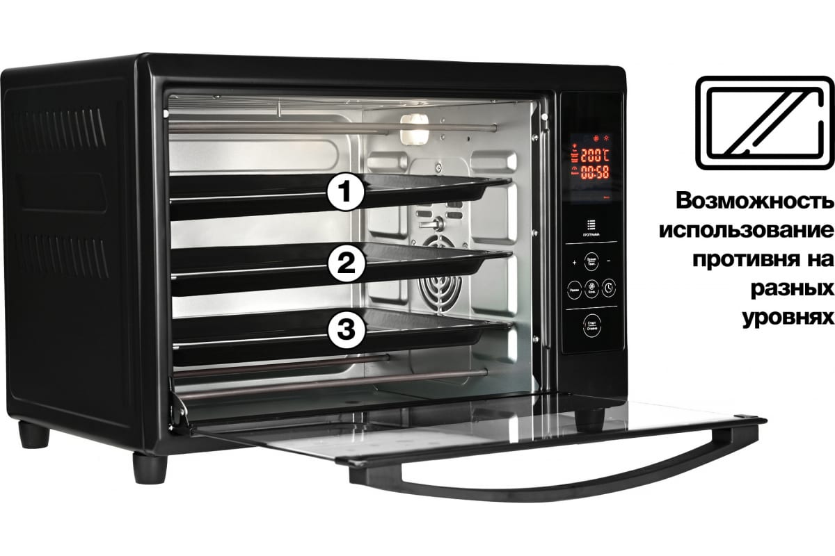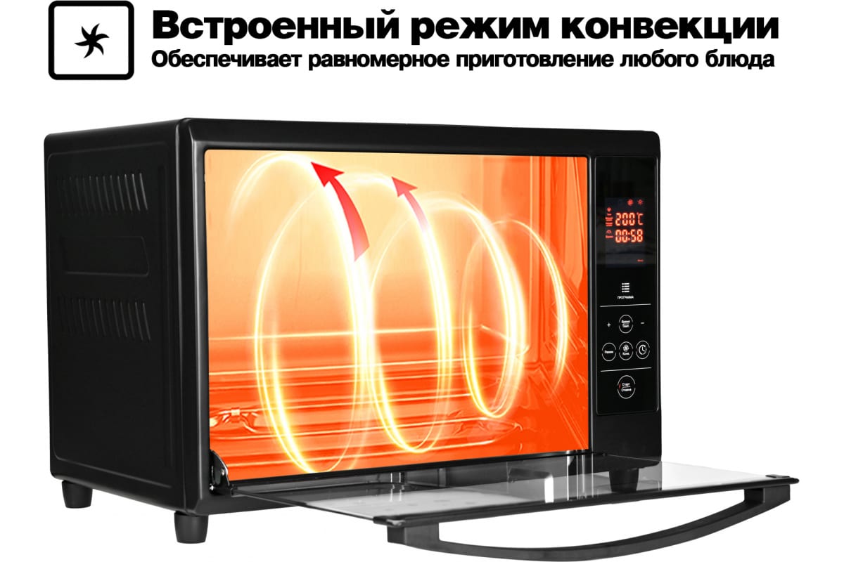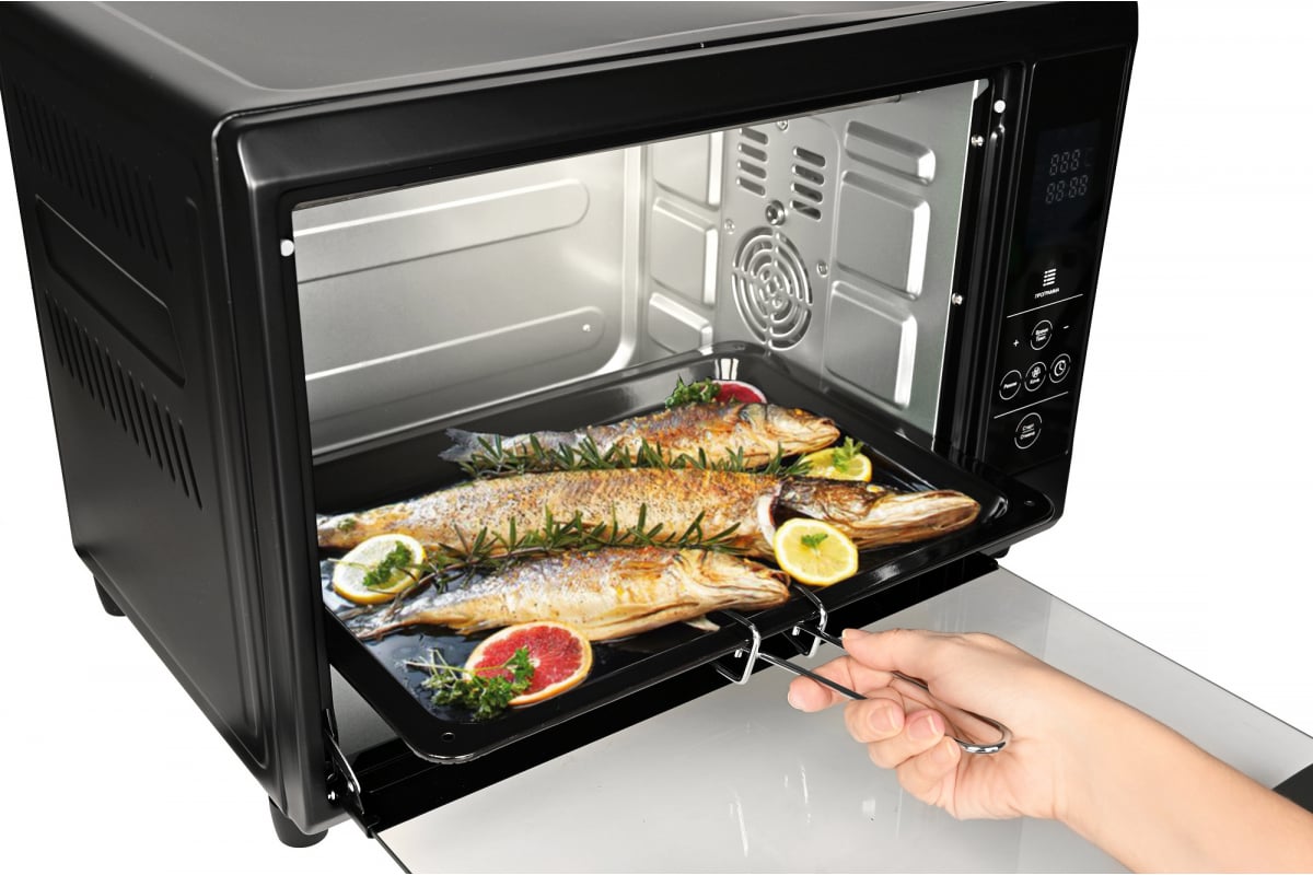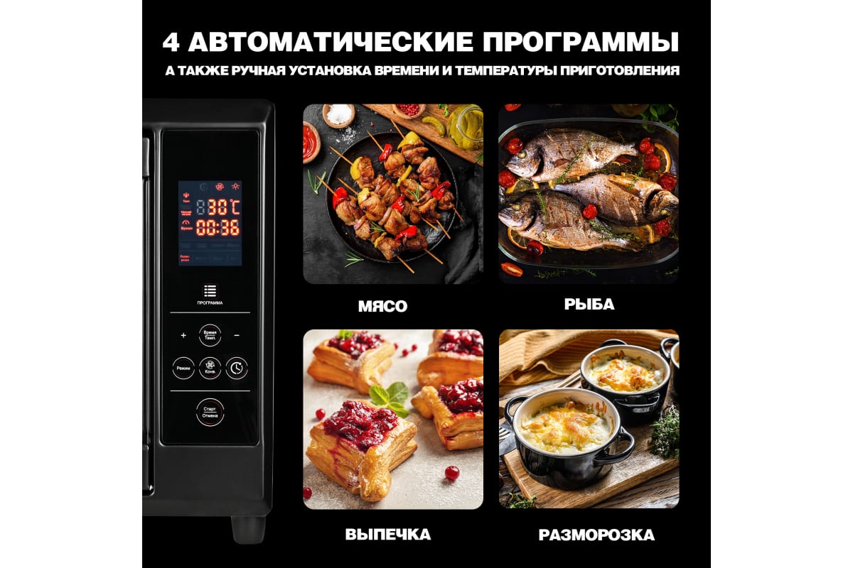 Многофункциональная мини-печь GFGRIL GFOO-5 отличается удобным электронным управлением с возможностью выбора одной из 4-х предустановленных программ (Мясо, Рыба, Выпечка или Разморозка). Конвекция в сочетании с различными режимами работы (Вертел/Верхний нагрев/Нижний нагрев/Нагрев), а также широкий набор аксессуаров, входящих в комплект - противень, решетка-гриль, вертел, шашлычница, камень для пиццы и антипригарный коврик - дают простор для воплощения любых кулинарных фантазий. Предустановленные температуру и время в каждом режиме можно корректировать вручную - температура регулируется от 25 до 230оС, а время - от 1 мин до 10 часов. Функция Отложенный старт дает возможность получить свежеприготовленное блюдо к установленному времени. Высокая мощность 2000 Вт. Благодаря оптимальным размерам мини-печь экономит место и удобна при транспортировке. Она подойдет для маленькой кухни, дачи, квартиры-студии, автодома или офисного помещения. Внутренняя камера мини-печи имеет поверхность легкой чистки, а также оснащена подсветкой для возможности наблюдения за процессом приготовления.