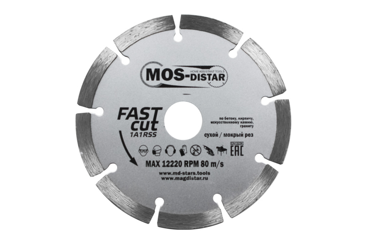 Диск алмазный 1A1RSS FAST CUT или БЫСТРЫЙ РЕЗ 115х1,8х7х22,23 от MOS-DISTAR – это сегментный диск, разработанный для обработки камня (искусственного или натурального). Он обладает высокой скоростью реза, рассчитан на оперативную обработку материала. За счет сегментного строения корпуса диск может работать без дополнительного охлаждения, не теряя при этом режущих свойств.