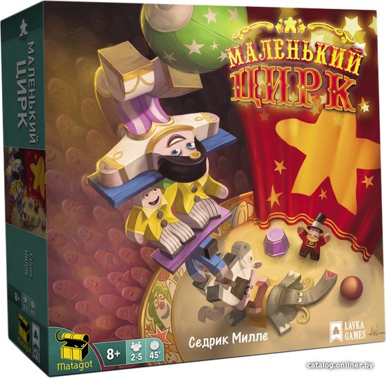 - Комплектация - Поле с аплодисмометром (трек победных очков)- Ростомер (для измерения высоты композиций из фигурок)- 3 планшета оценок- 5 двусторонних манежей (игровые поля)- 5 фишек игроков- 32 карты заказов публики- 38 жетонов цирковых номеров:6 жетонов 1-го отделения10 жетонов 2-го отделения (приглашённые артисты)10 жетонов 3-го отделения (испытания)12 жетонов 3-го отделения (испытания, мини-дополнение «Шутки и трюки»)- 18 жетонов элементов- 32 фигурки акробатов:12 начинающих13 опытных7 мастеров- 10 фигурок приглашённых артистов:морской левверблюддрессировщик слоновТарзангимнасткашпрехшталмейстерсилачвольтижёркаклоунтигр- 10 фигурок животных:6 лошадей4 слона- 22 фигурки реквизита:7 перекладин6 шаров9 бочек- 2 жетона скорости- Жетон первого игрока- Лист с наклейками (для наклеивания на фигурки)- Правила- Мини-дополнение «Помидоры и награды»25 жетонов помидоров5 жетонов наград1 жетон 3-го отделения «Клоун»Правила