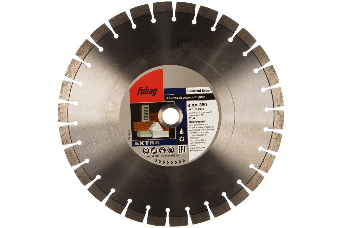 Алмазный отрезной диск Universal Extra FUBAG 32350-6 является сменным элементом для плиткорезов. Применяется для реза бетона, выдержанного бетона, армированного бетона, красного кирпича, натурального и искусственного камня и различных строительных материалов. Высота сегментов — 14 мм.