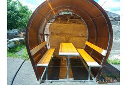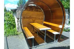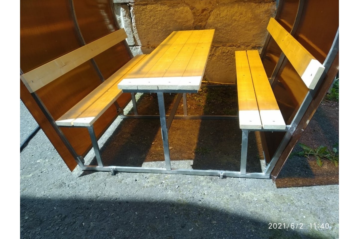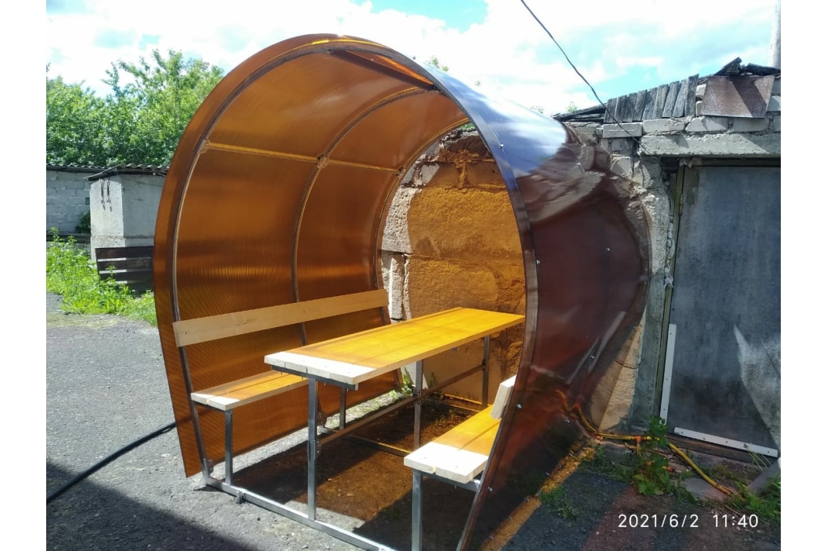 Прямоугольная конструкция металлической беседки выполнена из оцинкованной профильной трубы 40х20, скамьи и стол сделаны из строганой доски 30х140, кровля изготовлена из сотового поликарбоната (в комплект поставки не входит), каркас оцинкован - коррозия или ржавчина конструкции исключена.