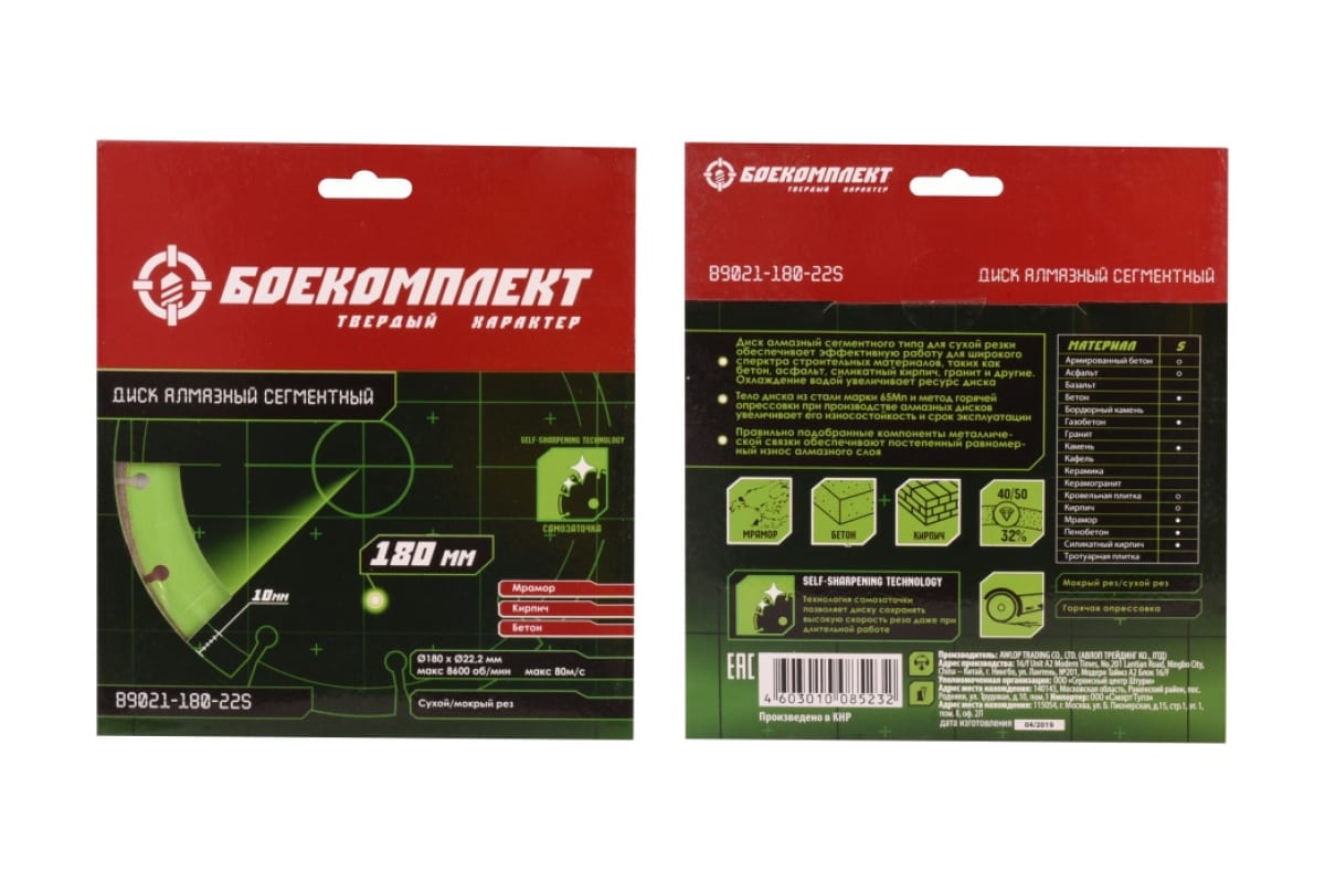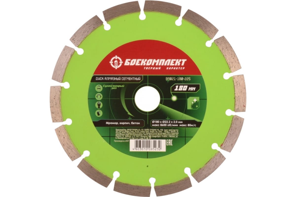 Диск алмазный сегментный БОЕКОМПЛЕКТ B9021-180-22S предназначен для угловых шлифовальных машин и ручных резчиков. Применяется для сухой/мокрой резки газобетона, пенобетона, асфальта, силикатного кирпича, гранита и мрамора.