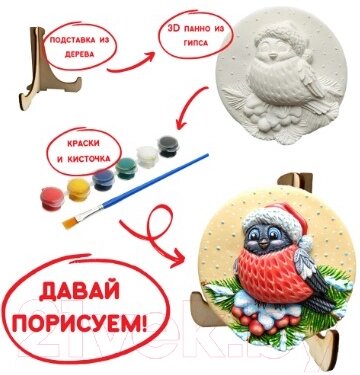 • Комплектация набора белое 3D панно из скульптурного гипса, кисточка, акриловые краски 6 шт, подставка для панно из дерева.