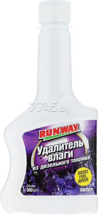 Присадка в дизельное топливо влаговытесняющая RUNWAY 300 мл (RW3071) удаляет влагу из топливного бака и топливной системы дизельного двигателя. Предотвращает коррозию топливного бака, образование отложений и засорение форсунок дизельного двигателя, препятствует обледенению топливной системы в зимнее время года. Применение: залейте содержимое флакона в топливный бак из расчета 1 флакон 300 мл на 40-60 литров дизельного топлива.