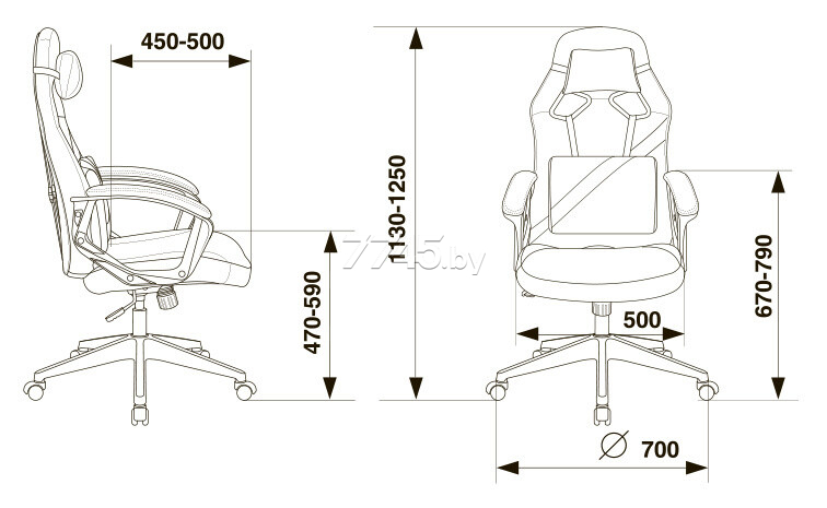 Высота подлокотника: 20 см. Высота с подлокотниками: 67-79 см. Диаметр колес: 50 мм. Диаметр крестовины: 70 см.