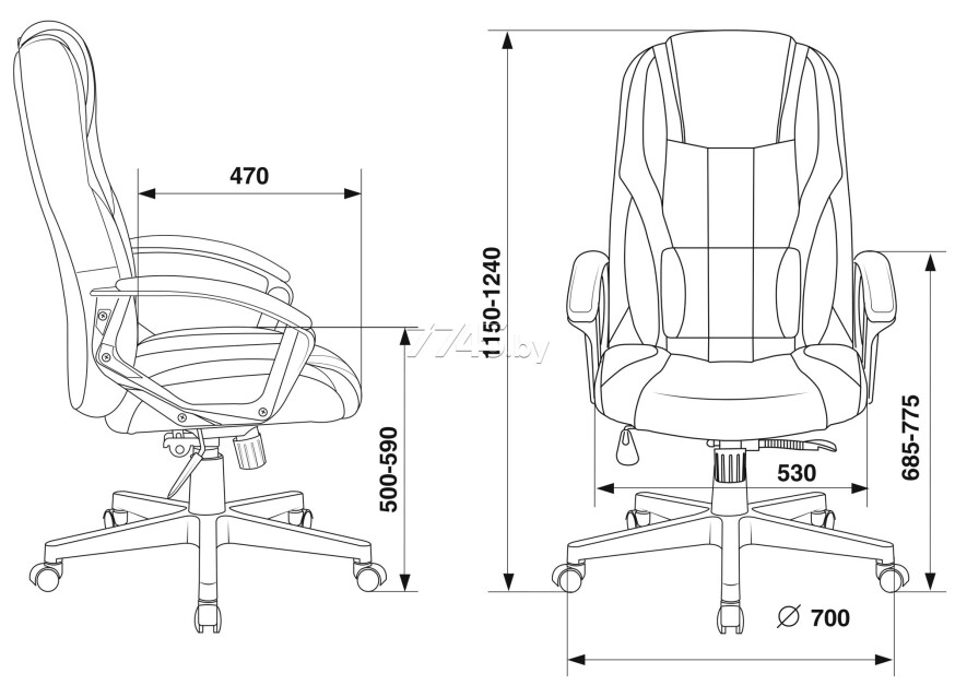 Высота подлокотника: 18,5 см. Высота с подлокотниками: 68,5-77,5 см. Диаметр колес: 50 мм. Диаметр крестовины: 70 см.