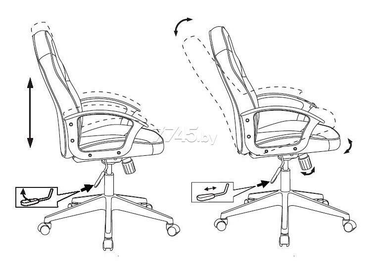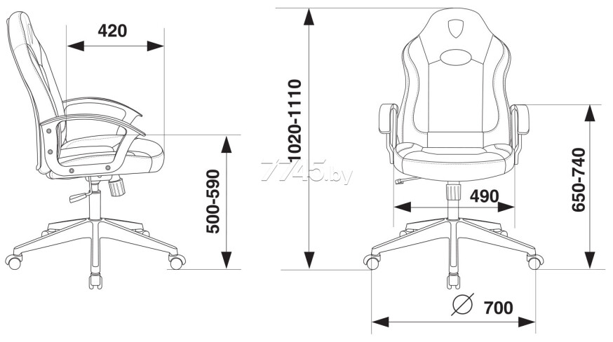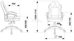 Высота подлокотника: 15 см. Высота с подлокотниками: 65-74 см. Диаметр колес: 50 мм. Диаметр крестовины: 70 см.