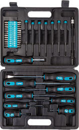 Универсальный набор из 42 предметов: набор бит 25мм 25шт (SL3, SL4, SL5, SL6, SL7, PH0, PH1, PH2, PH3, PZ0, PZ1, PZ2, PZ3, T10, T15, T20, T25, T30, T40, H2, H3, H4, H5, H5.5, H6); отвертка 150мм 2шт (PH3, SL8); отвертка 100мм 2шт (PH2, SL6); отвертка 75мм 2шт (PH1, SL5); отвертка 37мм 2шт (PH2, SL6); отвертка-держатель для бит; удлинитель гибкий 1/4'; часовая отвертка 50 мм 7 шт (SL2, SL2.4, SL3, PH0, PH1, T15, T20)..