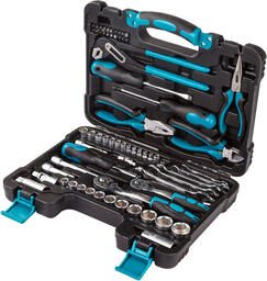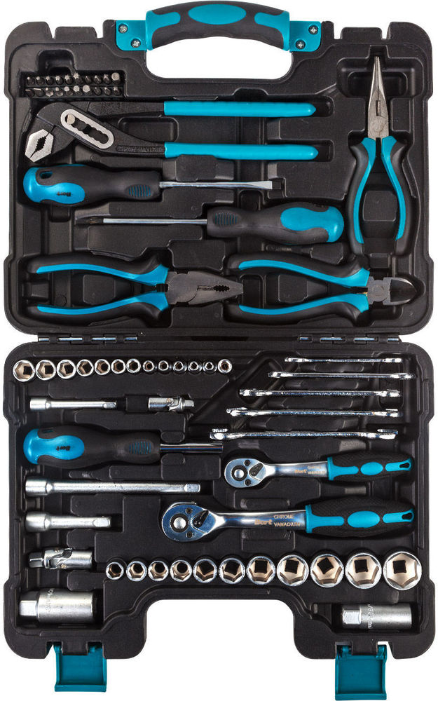 Универсальный набор из 65 предметов: головки 1/4' (12); головки 3/8' (11); шарнир карданный 1/4; шарнир карданный 3/8”; свечной ключ квадрат 3/8 16мм; свечной ключ квадрат 3/8 21 мм; удлинитель квадрат 3/8 3'; удлинитель квадрат 3/8 6'; удлинитель квадрат 1/4 3'; ключ трещеточный 1/4'; ключ трещеточный 3/8'; отвертка: 2; бита 25 мм (20); длинногубцы 160мм; клещи переставные 240мм; бокорезы; плоскогубцы 180мм; ключ гаечный (5); отвертка-держатель для бит; муфта..