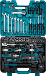 Универсальный набор из 89 предметов: головки 1/4' (13), головки 1/2' (9), удлинитель квадрат 1/4 3', удлинитель квадрат 1/2 5', головка торцевая свечная 1/2', рукоятка с трещеткой квадрат 1/2, рукоятка с трещеткой квадрат 1/4, ключ комбинированный (8), отвертка (7), отвертка-держатель для бит, ключ имбусовый (9), бокорезы, плоскогубцы 160 мм, длинногубцы 160 мм, нож, ножовка по металлу, молоток, рулетка, бита 25 мм (20), лезвие для ножа (10)..