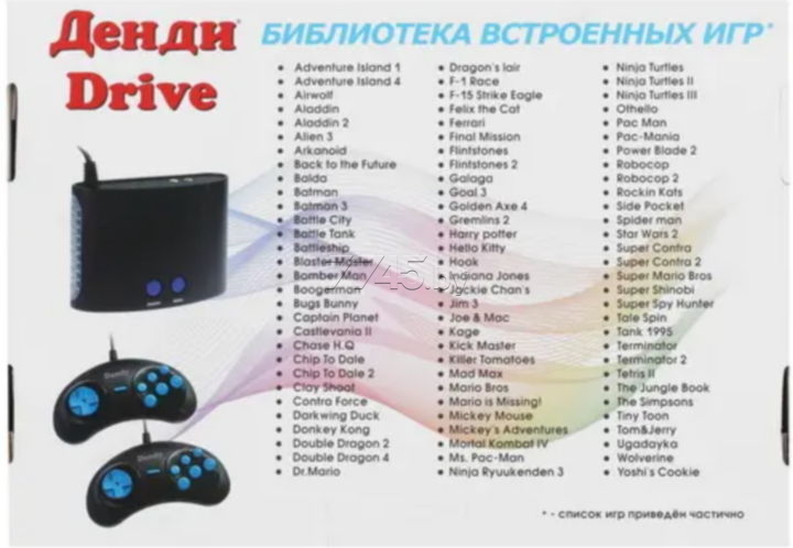 Игровая приставка DENDY Drive 8bit (300 игр) – это новая модель популярной игровой приставки Денди без разъема для картриджей, с большим сборником встроенных игр. В число этих игр вошли основные хиты формата 8-бит и 6 игр для светового пистолета (Duck Hunt, Gotcha, Hogan's Alley, Sharp Shooter, Shooter 2, Wild Gunman). В сборник включены только полные версии игр. К сети 220В приставка подключается через неразъемный кабель с двойной изоляцией, который имеет общую длину 150 см. Для Денди Drive разработана новая компактная цветная упаковка с матовой поверхностью, лакированными элементами и тиснением золотой фольгой.