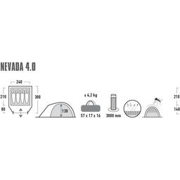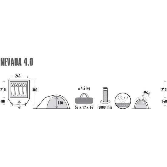 Палатка Nevada 4 - просторная палатка для семейных путешествий с обширным тамбуром для хранения снаряжения. Отлично подойдет для походов с апреля по сентябрь. Палатка легко устанавливается за 4-5 минут.Палатка Nevada 4 имеет:Отражающее покрытие тента. Образует тепловой барьер и предотвращает чрезмерный нагрев палатки. Позволяет оставить палатку закрытой в течение всего летнего дня и затем спать в ней без помех от перегрева даже в жаркие летние ночи.Внешний тент с защитой от УФ-лучей.Материал тента имеет полиуретановое покрытие и водонепроницаемость не менее 3000 мм водяного столба. Это позволяет защититься от сильного ветра и дождя. Темный внутренний тент обеспечивает дополнительный комфорт сна.Система вентиляции Варио Вент Контрол позволяет постоянно наполнять палатку воздухом и равномерно распределять его по палатке.Проклеенные швы.При фиксации всех пяти оттяжек палатка имеет высокую ветроустойчивость.Окно для вентиляции находится в верхней точке купола палатки. Во внутренней палатке имеются кармашки для разных мелочей.Размер - 300х240х130 смРазмер в чехле - 57х17х16 смМатериал тента - полиэстер 3000 мм.Материал дна - армированный полиэтилен 5000 ммМатериал дуг - фибергласс 8.5 мм/7.9 мм
