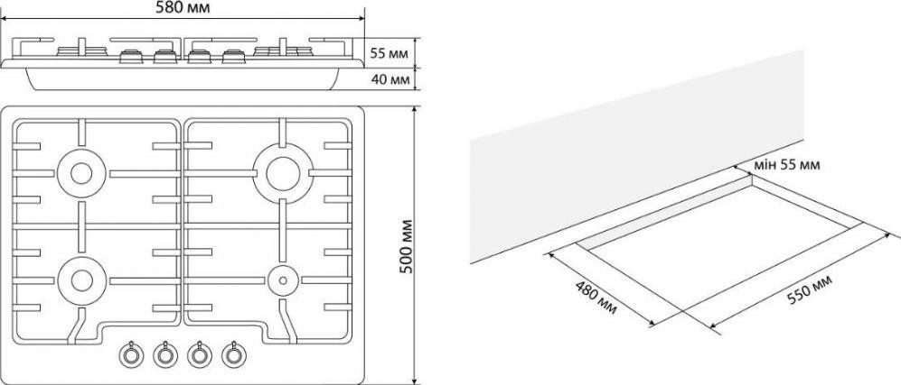 • Диаметр и мощность конфорок Задня ліва 1.7 кВт, Задня права 2.5 кВт, Передня ліва 1.7 кВт, Передня права 0.9 кВт