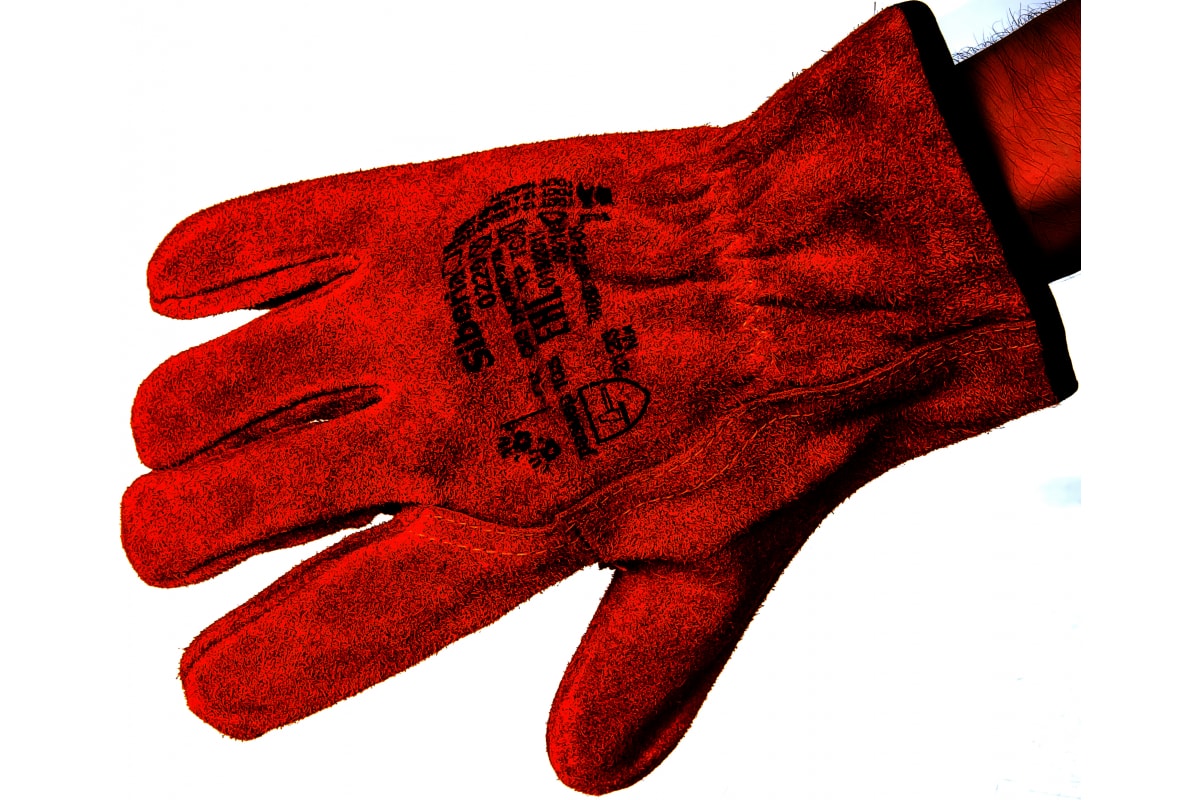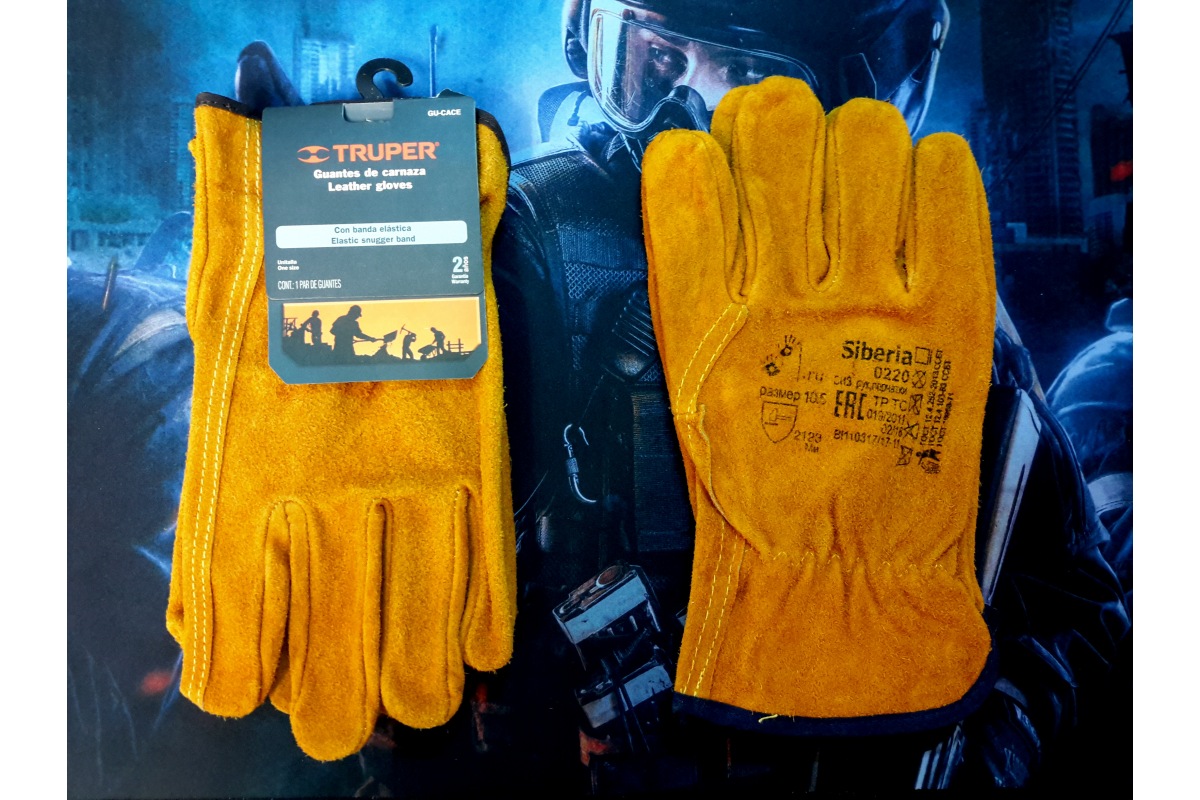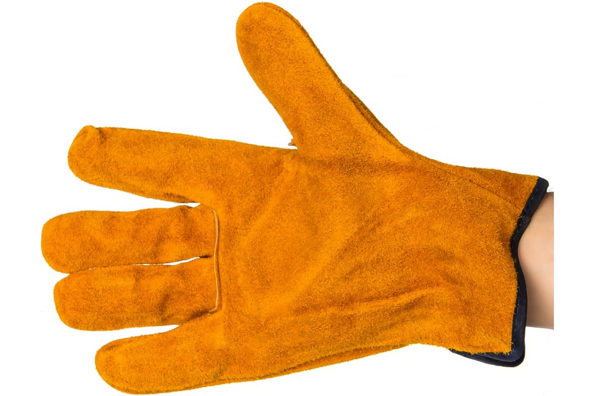Изделия изготовлены из говяжьего спилка класса А. Манжет прошит по периметру эластичной х/б тесьмой. Размер перчаток - 10.5.
