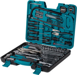 Универсальный набор из 86 предметов: торцевые головки 1/2 (10), торцевые головки 1/4 (11), трещотка 2 (1/2 , 1/4 ), удлинители 1/2 , головка свечная 1/2 , комбинированные ключи (10), угловые ключи шестигранные (9), пассатижи, длинногубцы, ключ разводной, рулетка 5 м, молоток, нож, ножовка, отвертки 6 (PH, SL), отвертка под биты, биты (насадки-отвертки) 20 (Hex, Torx, Phillips, Pozidriv, Slotted), напильники (полукруглый, треугольный), пинцет..