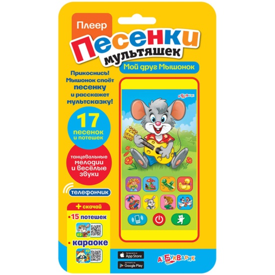 Интерактивный плеер-смартфончик с любимыми мультяшками! Прикоснись к Мышонку, и он расскажет сказку и споёт песенки: «Какой чудесный день!», «Мир похож на цветной луг», «Песенка о лете», «Карусельные лошадки»,