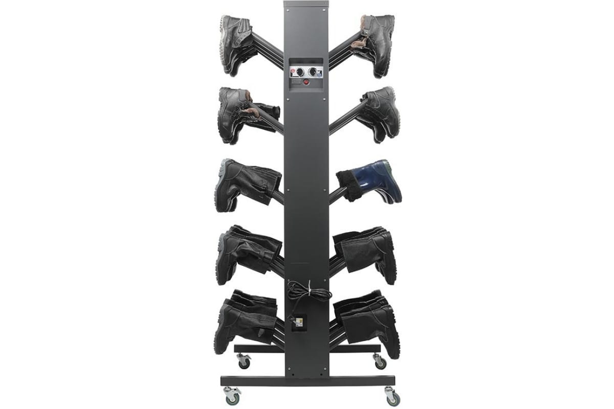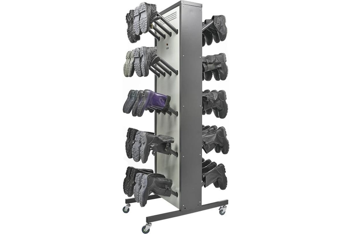 Влажная обувь навешивается на расположенные на корпусе стойки кронштейны, через которые подается теплый воздух.