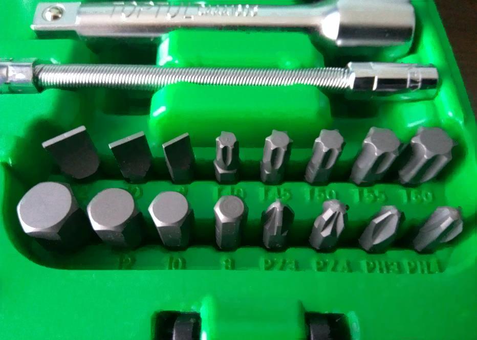 • Комплектация Головка торцевая 1/4": 4, 4.5, 5, 5.5, 6, 7, 8, 9, 10, 11, 12, 13 ммГоловка торцевая 1/2": 14, 15, 16, 17, 18, 19, 20, 22, 24, 27, 30, 32 ммСвечная головка 1/2" магнитная: 16, 21 ммТрещотка 1/4" 36 зубцов (резиновая ручка)Трещотка 1/2" 36 зубцов (резиновая ручка)Ключи комбинированные 8,10,11,12, 13,14,17,19, 22 ммГоловка с насадкой Hex 1/4": 3, 4, 5, 6 ммГоловка с насадкой Torx 1/4": T8, T10, T15, T20, T25, Т 27, T30Головка с шлицевой насадкой 1/4": 4, 5.5, 6.5 ммГоловка с насадкой PH 1/4": PH1, PH2Насадка PZ 1/4": PZ1, PZ2Насадка 5/16" Hex: 8, 10, 12, 14 ммНасадка 5/16" Torx: T40, T45, T50, T55, 60Насадка 5/16" для ударной отвертки: 8,10,12 ммНасадка 5/16" PZ: PZ3, PZ4Удлинитель 1/4" 50 ммУдлинитель 1/4" 100 ммУдлинитель 1/2" 125 ммУдлинитель 1/2" 250 ммКардан 1/4"Кардан 1/2"Вороток-отвертка 1/4"150 ммВороток 1/4" с плавающей головкой 115 ммДержатель бит 1/2 х 5/16"Гибкий вал 1/4"Переходник 3/8 х 1/2"с отверстием