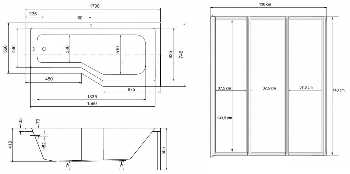 - Papildoma informacija Sienos matmenys 130×140 cm. Vonios išdėstymas – kairė pusė.