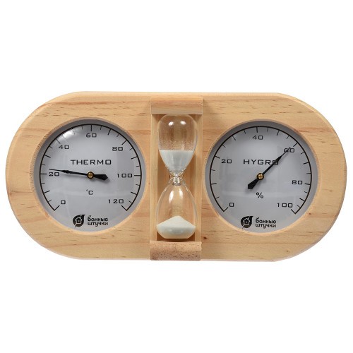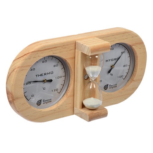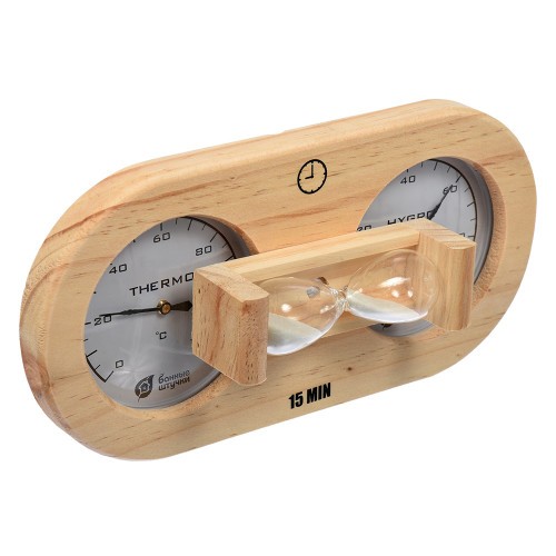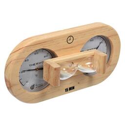 Термометр и гигрометр с песочными часами для бани и сауны "Банная станция" Размер: 27х13,8х7,5см Материал: дерево, стекло, металл