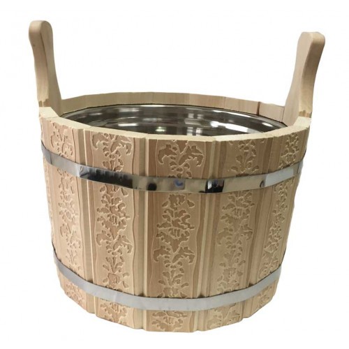 Шайка 10л с нержавеющей вкладкой с тиснением "Цветы"- сделана из натурального дерева и предназначена для использования в бане. Вставка из нержавейки продлит срок службы изделия. Возможен орнамент "Под старину"