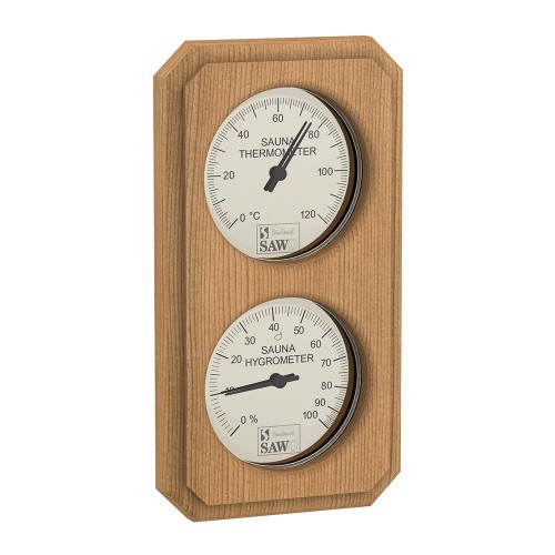 Термогигрометр 221-THVD от компании Sawo имеет оригинальную прямоугольную форму и вертикальную ориентацию. В широкой рамке из древесины кедра находится два круглых окошка. Под стеклом каждого окошка расположен графичный циферблат. Один из них - это гигрометр, который с точностью измерит уровень влажности в парной, другой - термометр, который сообщит о температуре воздуха. Данный прибор прекрасно подойдёт для использования в любом парильном помещении. В нашем интернет-магазине представлен широкий ассортимент измерительных приборов в корпусах из разных видов древесины. Вы можете купить по привлекательной цене модель 221-THVD или присмотреться к другим вариантам.Качественные банные процедуры требуют соблюдения ряда правил. Чтобы проведённое в парной время оказало благоприятный эффект на здоровье и самочувствие, необходимо тщательно соблюдать температурный режим парения и режим влажности. Так например, если вы отдыхаете в условиях классической финской сауны, влажность воздуха не должна превышать 10-15% при температуре до 120 градусов. Русская баня - это температура воздуха 60-90 градусов и влажность в диапазоне от 45% до 65%. Хамам отличается густым паром, создающим 90-100% влажности и температурой воздуха до 45 градусов. Именно такие условия считаются оптимальными.Для контроля за режимом парения компания Sawo создала целую линейку измерительных приборов. Высокое качество гарантирует надёжность и точность измерений. Среди большого количества форм и размеров каждый сможет подобрать для себя подходящий аксессуар.Размеры (Ш х Г х В), мм 125 х 30 х 200