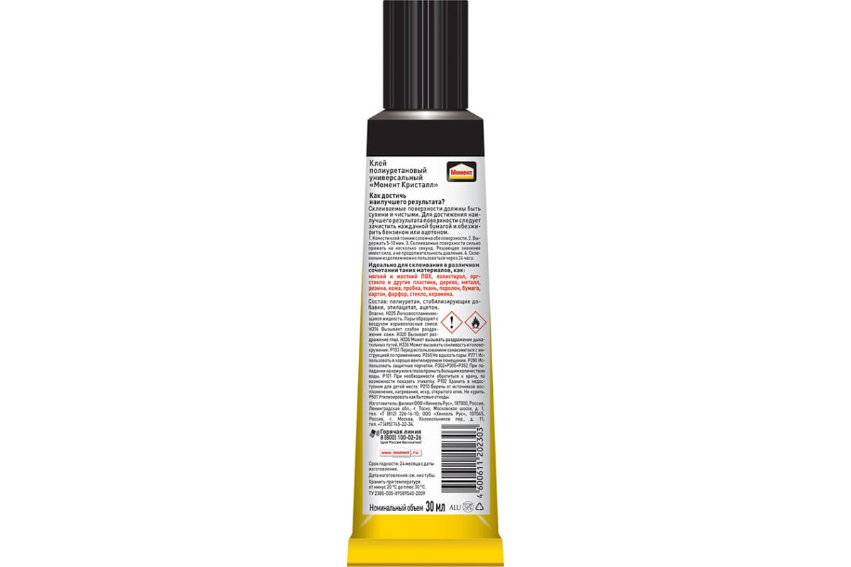 Клей Кристалл Момент 422974 является полиуретановым и предназначен для склеивания следующих материалов: мягкого и жесткого поливинилхлорида, полистирола, оргстекла и других пластиков. Можно склеивать в различных сочетаниях дерево, металл, резину, бумагу, картон, кожу, ткань, пробку, поролон, фарфор, керамику, стекло. Шов получается высокопрочным и водостойким. Нельзя использовать для посуды, контактирующей с пищей. Необходимо хранить при температуре о -20ºС до +30ºС. Если клей замерз, то свои свойства он восстановит при комнатной температуре. Поставляется на блистере.