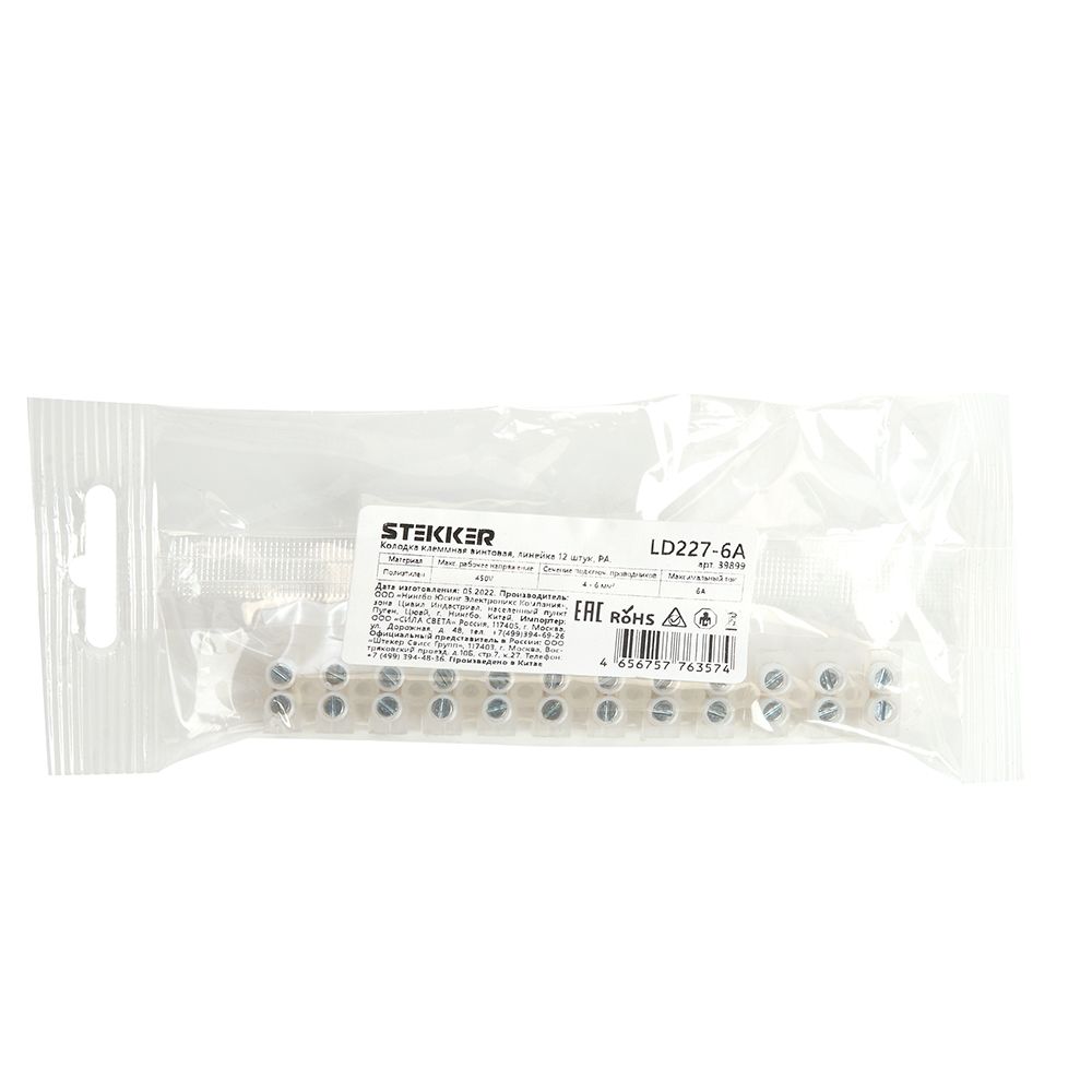 Колодка клеммная винтовая STEKKER, линейка 12 штук, полиэтилен, LD227-6A DIY 39899