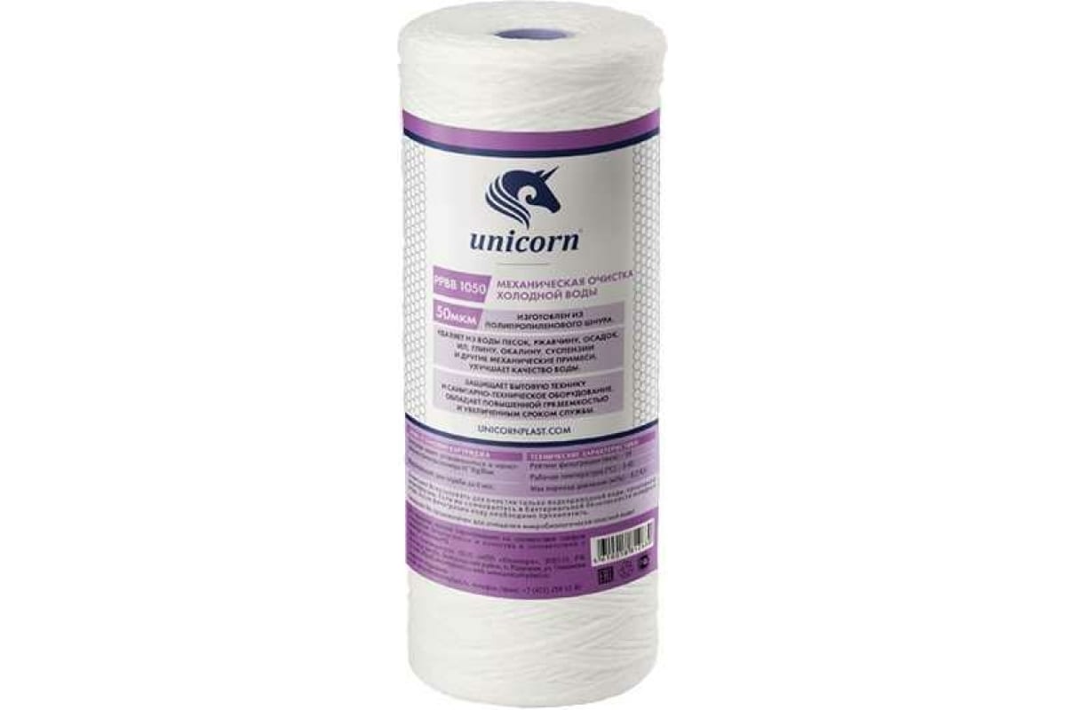 Механический картридж Unicorn из полипропиленового шнура, 10'' BB, 50 мкм, PP BB 1050 541190 удаляет из воды песок, ржавчину, осадок, ил, глину, окалину, суспензии и другие механические примеси.