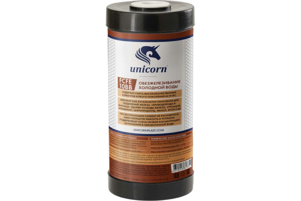 Картридж для удаления железа Unicorn 10'' ВВ FCFE 10BB 536817 содержит смесь высококачественных сорбентов нового поколения АС и МС.