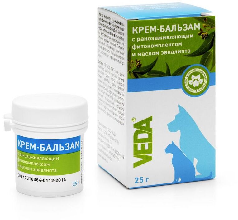 Крем-бальзам Веда зоогигиеническое защитное средство с с ранозаживляющим фитокомплексом и маслом эвкалипта предназначен для ухода за проблемной кожей собак, кошек и других домашних животных с целью улучшения регенеративных и репаративных процессов.