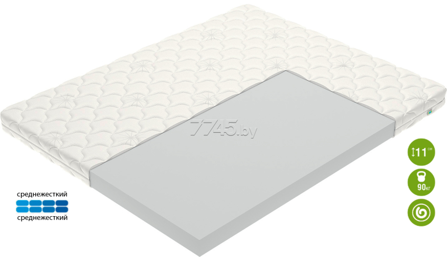 Матрас беспружинный VEGAS Хит 5 90х200х11 см — невысокая модель на основе эластичного пенного материала Smartflex, придающего матрасу вентилируемость и комфортную упругость. Обе стороны матраса среднежесткие. Высота матраса — 11 см, максимальная нагрузка на спальное место составляет 90 кг. Изделие поставляется в скрученном виде.