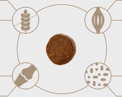 - Состав Мука куриная 30%, цельнозерновая кукуруза, жир птицы, цельнозерновой ячмень, цельнозерновой овес, гидролизованное куриное мясо, сушеный свекольный жом, пивные дрожжи, льняное семя, лиофилизированная курица, мононатрийфосфат, инулин