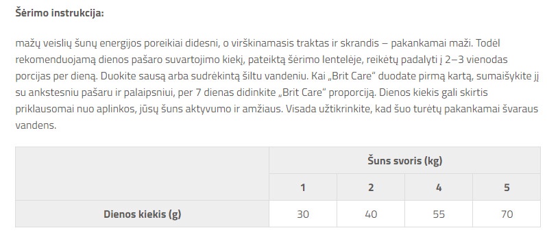 - Дополнительная информация Собаки мелких пород имеют более высокие потребности в энергии и относительно небольшой желудочно-кишечный тракт. Поэтому рекомендуемую суточную норму в рационе следует разделить на 2-3 равные порции в день. Дают сухим или смоченным теплой водой. Когда вы даете Brit Care в первый раз, смешайте его с предыдущим кормом и постепенно увеличивайте долю Brit Care в течение 7 дней. Количество дней может варьироваться в зависимости от окружающей среды, активности и возраста вашей собаки. Всегда следите за тем, чтобы у вашей собаки было достаточно чистой воды.