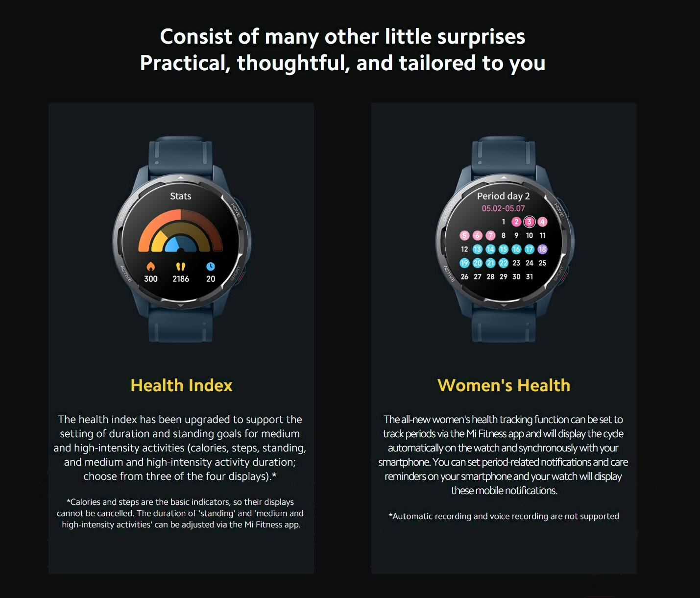 • Здоровье мониторинг сердечного ритма (ЭКГ), мониторинг сна, мониторинг уровня кислорода в крови, мониторинг уровня стресса, женский календарь