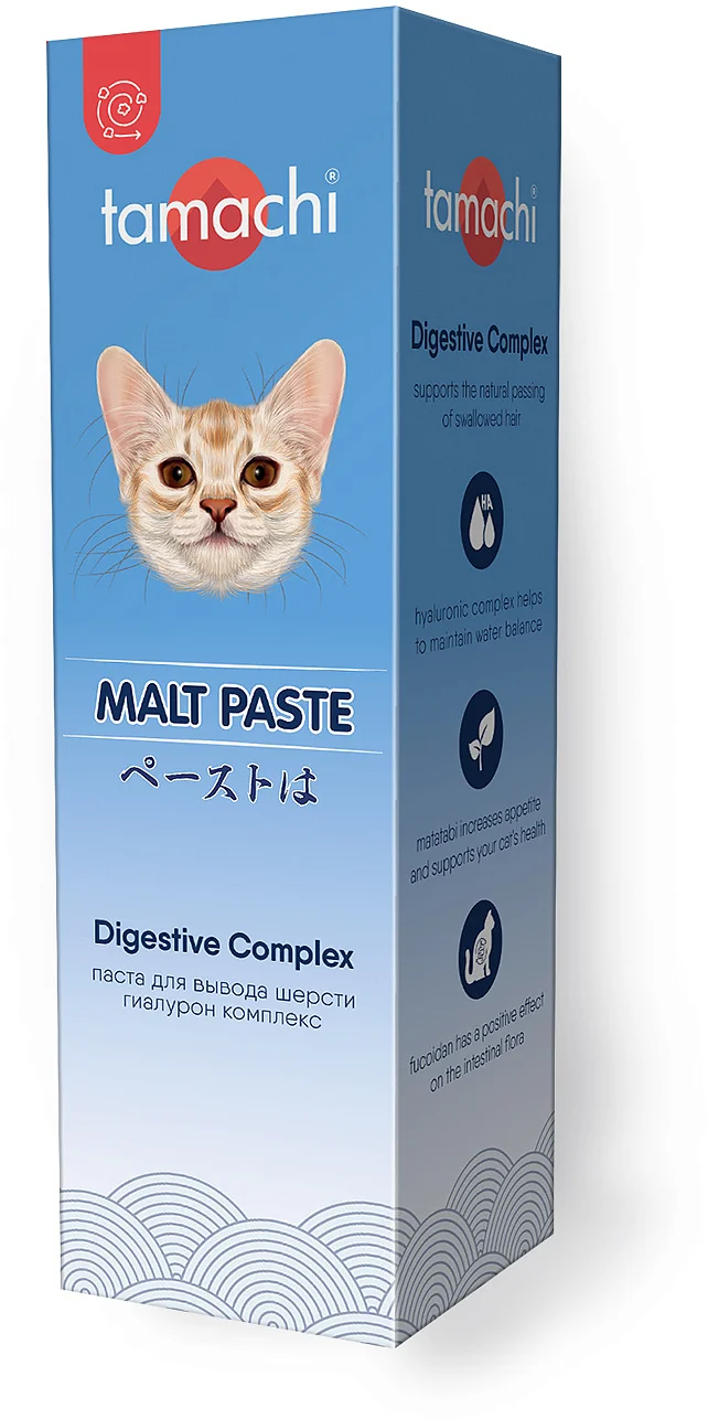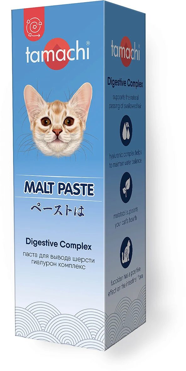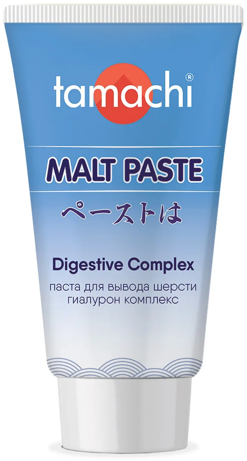 Тамачи Мальт-пасту применяют для вывода волосяных комков из желудочно-кишечного тракта, профилактики их образования и избавления от рвоты и запоров. Уникальная формула активных компонентов: гиалуроновый комплекс способствует поддержанию нормального водного баланса в организме, является частью внеклеточного матрикса, обеспечивающего механическую поддержку клеток и транспорта химических веществ, мататаби улучшает аппетит, оказывает общеукрепляющее и болеутоляющее действие, фукоидан оказывает позитивное воздействие на кишечную флору и нормализуют функции желудочно-кишечного тракта.