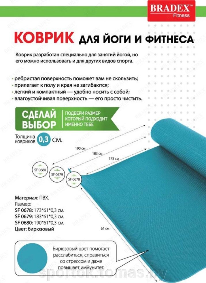 Коврик для йоги и фитнеса Bradex SF 0693, 173*61*0,3 см, бирюзовый с переноской