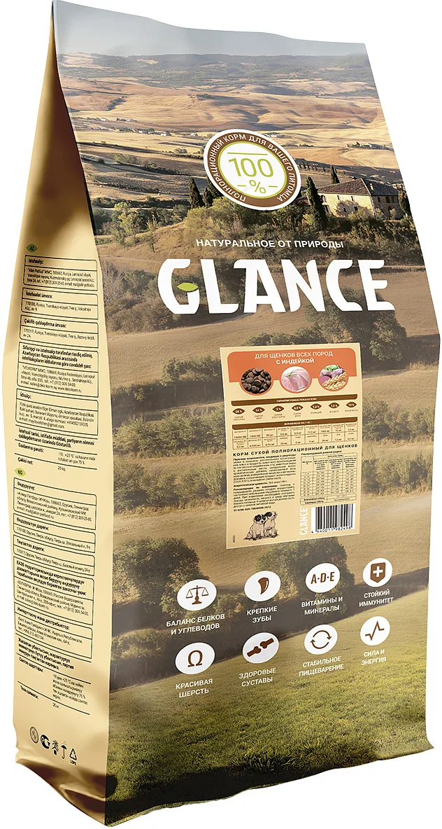 Glance (Глэнс) с индейкой – полнорационный сухой корм, созданный специально для щенков. Корм рекомендован для кормления щенков всех пород с 2-х до 12-ти месяцев.