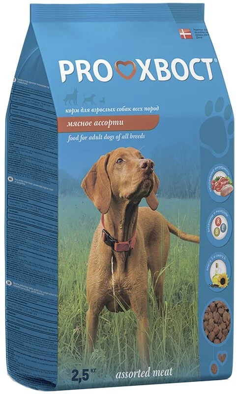 В состав корма PROХВОСТ для взрослых собак с мясным ассорти входит до 80% натуральных мясных ингредиентов, а также жизненно важные витамины, минералы, микроэлементы и вещества, необходимые для полноценного питания.