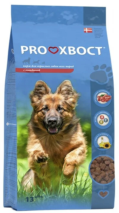 Сухой корм с мясом говядины для взрослых собак. Сбалансированное полнорационное питание с необходимыми витаминами и минералами подходит для ежедневного кормления питомцев любых пород.Накормить четвероногого друга больше не проблема! Корм Прохвост – сытный обед с мясом из говядины.Рецепт разработан при участии датских специалистов по кормлению собак. В меню вошли ингредиенты, которые понятны владельцам и нужны питомцам.Мясо – важнейший компонент в питании собак, поэтому в корм добавлено говядина. Она не такая жирная, как свинина и выигрывает по витаминно-минеральному составу.Злаки дают собаке энергию для подвижного образа жизни и прогулок на улице. Кроме того, являясь источником клетчатки, злаки стимулируют пищеварение.Корм Прохвост обогащен витаминно-минеральным комплексом в нужной пропорции, что упрощает жизнь хозяину. Во-первых, владелец не тратит деньги на витамины (экономия). Во-вторых, нет риска нарушить в организме питомца природный баланс веществ, что бывает, когда витамины даются отдельно.Форма гранул в виде сердечек придумана неслучайно. Съедобные фигурки, которые разгрызает собака, бережно очищают полость рта от зубного налета и выступают профилактикой против отложений на зубах.Корм Прохвост – полноценный рацион для ежедневного кормления. Здоровая альтернатива еде со стола и домашним кашам.