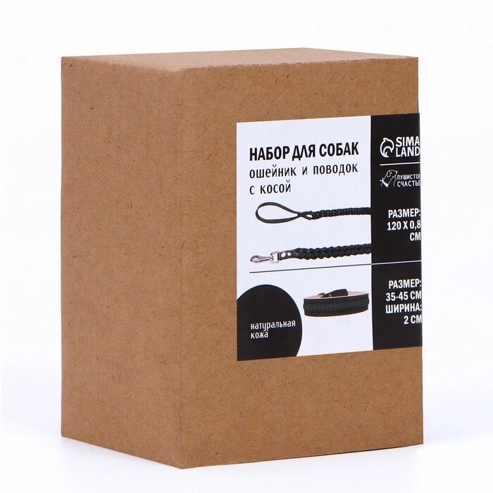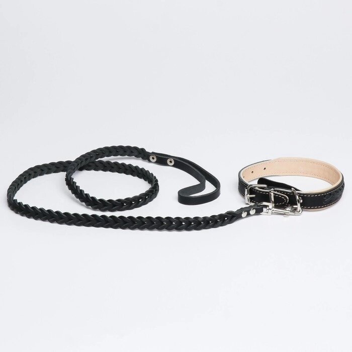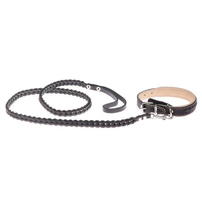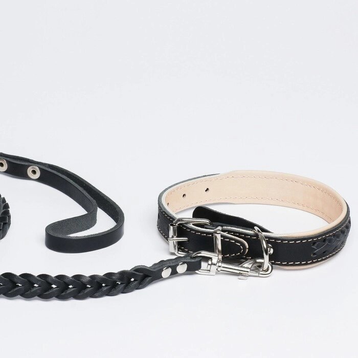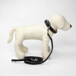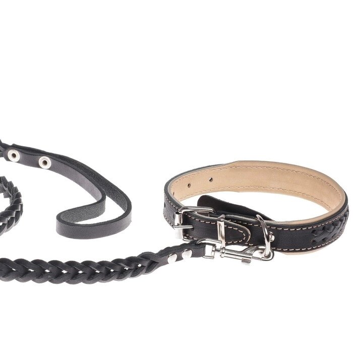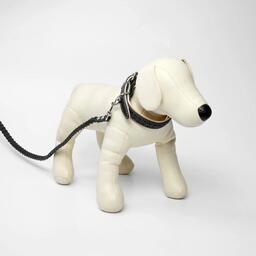 Комплект ошейник и поводок с косой, чёрный с бежевым