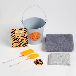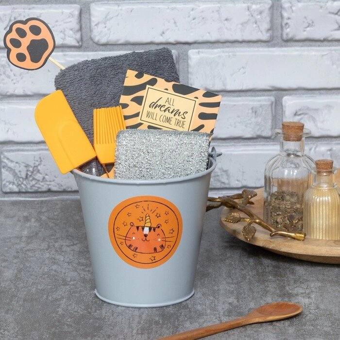 • Составляющие набора Полотенце, Декор, Открытка, Кухонная лопатка, Ведёрко, Кулинарная кисть, Губка для мытья посуды